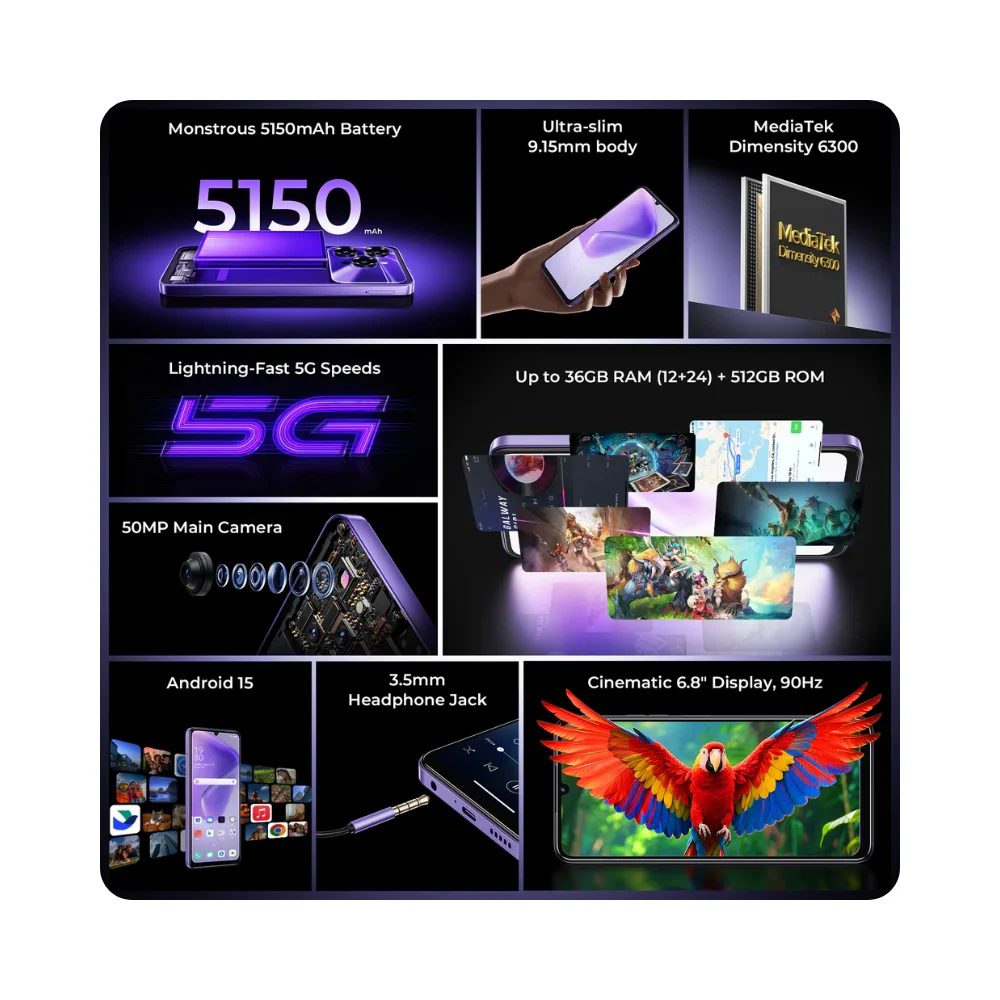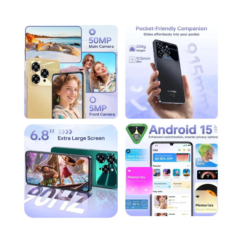 De Oukitel C6 5G biedt je een mobiele ervaring van de nieuwste generatie. Dankzij de compatibiliteit met 5G-netwerken kun je zware bestanden downloaden, content in hoge definitie streamen en online gamen met minimale latency. Binnenin zorgt de MediaTek Dimensity 6300-processor voor solide en efficiënte prestaties, zodat je optimaal kunt genieten van het nieuwe besturingssysteem Android 15.